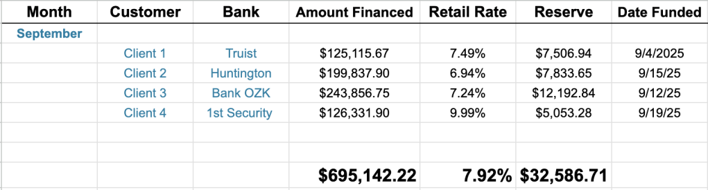 •Increased dealer reserve revenue from $204,748 in 2023 to $327,300 in 2024, and $410,215 YTD in 2025 (with three months still to go).